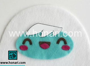 بعد از کامل کردن شکل مو با کاتر قسمت پایینی مو را روی نمد سفید برش دهید . قسمت آبی مربوط به صورت عروسك رو برداریدو موهای بریده شده را روی صورت عروسك بیارید و بدوزید،به تصاویر بعد دقت كنید تا بهتر متوجه بشید .