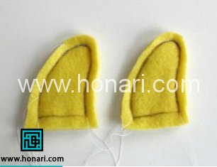 چهار قسمت زرد رنگ مربوط به شاخ های عروسك رو دو به دو روی هم قرار بدید و بدوزید اما سمت پایین اون ها باز بزارید و ندوزید .