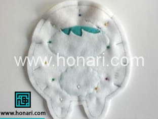 بجز یك قسمت كوچیك،دور تا دور عروسك رو بدوزید و بعد از دوخت،از اون قسمت دوخته نشده عروسك رو پشت رو كنید و بعد داخل اون رو با پشم شیشه پر كنید سپس اون قسمت دوخته نشده رو بدوزید .