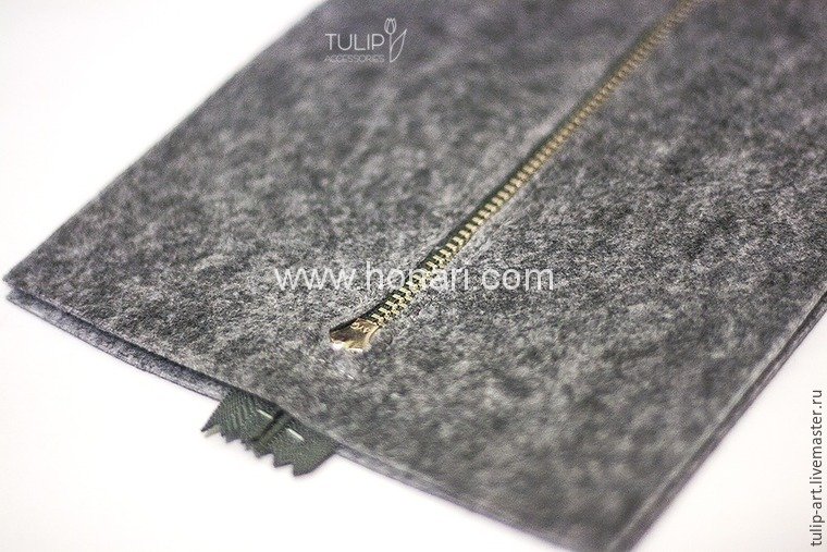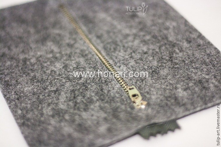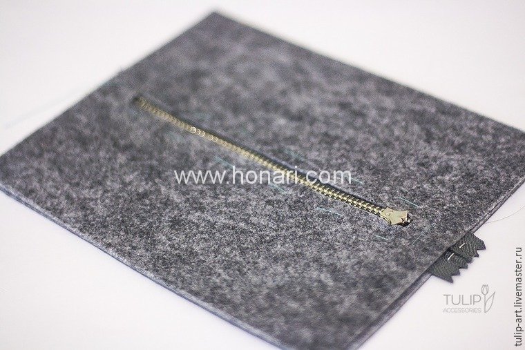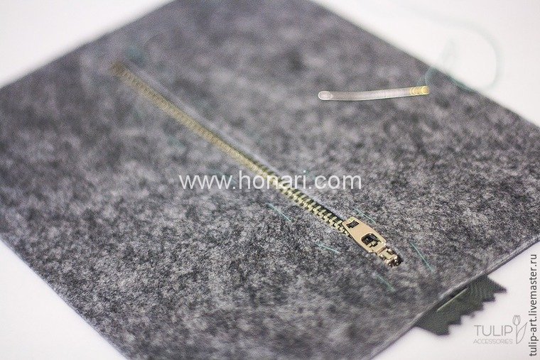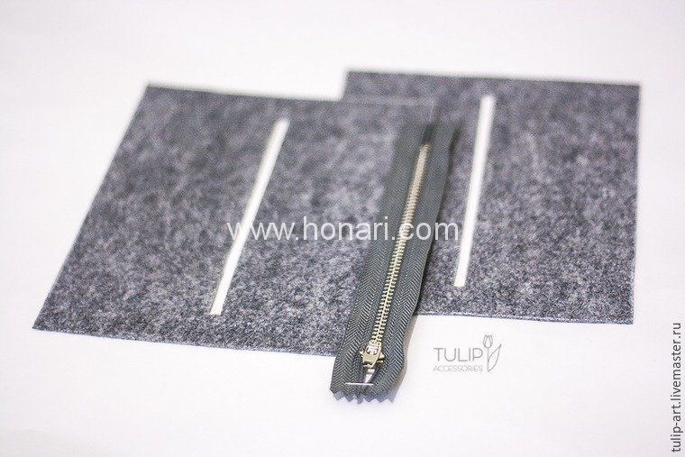 حالا قسمت زیپ دار ( محل نگه داری سکه ) را که در مرحله چهارم آماده کردیم درست در وسط کار قرار می دهیم مانند تصویر.