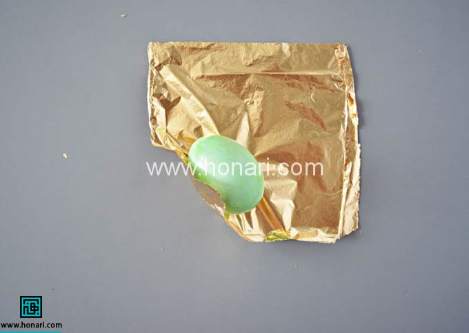 یک لایه بسیار نازک چسب تمام دور تخم مرغ بزنید. سپس، با دقت یک ورقه طلا بردارید و دور تخم مرغ بپیچید.