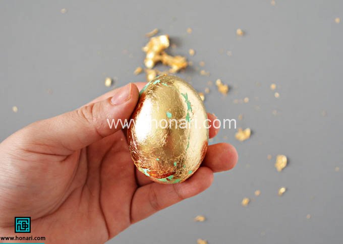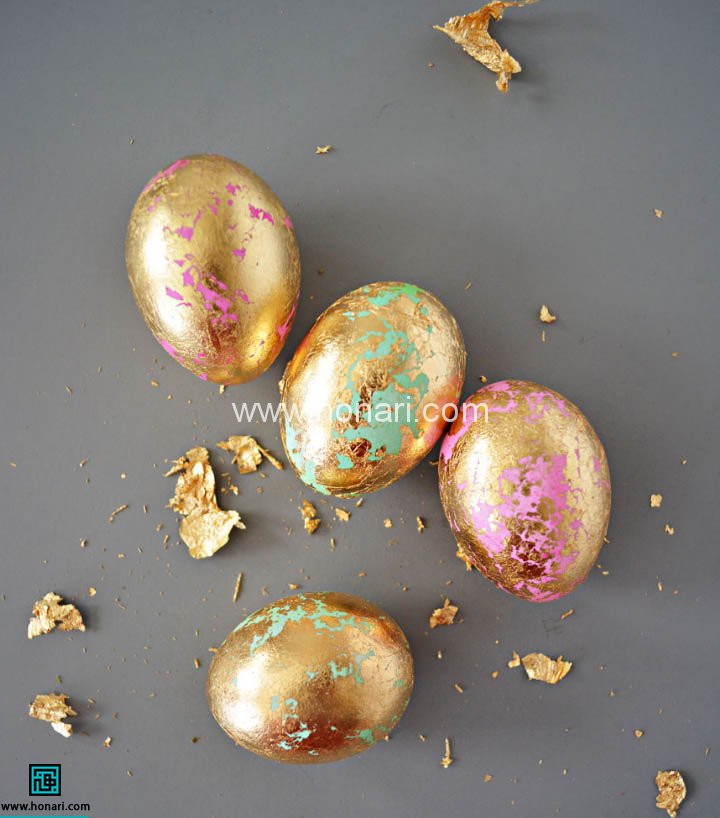 اضافه ورقه طلا را می توانید با نوک انگشتان بگیرید تا سطح صاف تری روی تخم مرغ داشته باشید. برخی از ترک ها را باز بگذارید. این کار باعث می شود که لایه زیرین بیشتر نشان داده شود و تنوع در کارتان ایجاد شود.