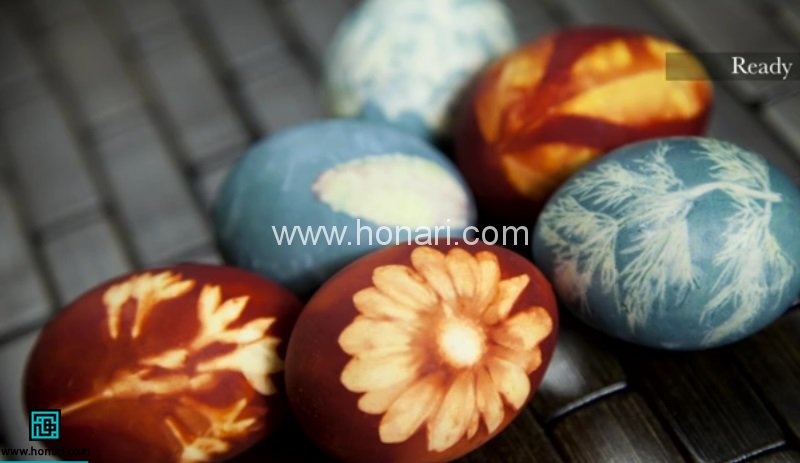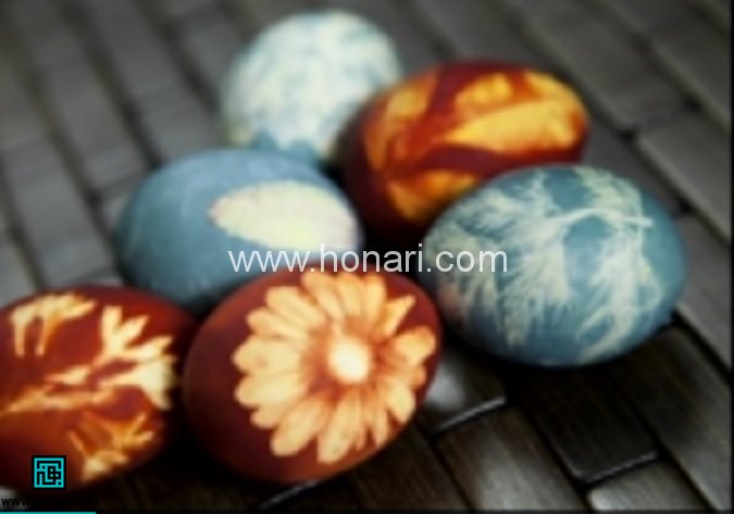 گل های ریز طبیعی و برگ های درختان را جدا می کنیم. گل ها را به صورتی که تصمیم داریم روی تخم مرغ قرار می دهیم در صورت نیاز از شاخه جدا کرده و قسمت های اضافی را قطع می کنیم. گل را درست روی تخم مرغ می خوابانیم و محکم با انگشتانمان نگه می داریم. جوراب را ما بین انگشتانمان گرفته و روی تخم مرغ به حالتی می کشیم که هیچ حرکتی روی گل نباشد و گل زیر جوراب و روی تخم مرغ ثابت بماند. جوراب را مثل کش کشیده و محکم گره می زنیم و تخم مرغ درونش محبوس می شود. گل های بعدی را هم به همین نحو مطابق با سلیقه روی تخم مرغ قرار داده و درون جوراب می اندازیم و گره میزنیم. برگ های آماده شده را هم به صورت کاملا چسبیده به تخم مرغ درون جوراب ها می اندازیم…