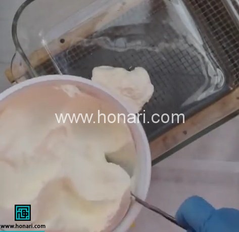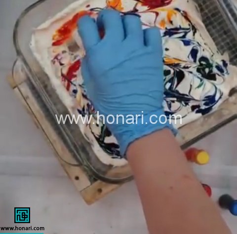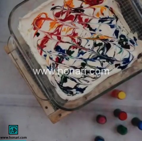 خامه را کف ظرف مورد نظر به ضخامت دو سانت خوابانده و چند قطره از رنگ های جوهری را به صورت لکه به روی آن اضافه می کنیم.