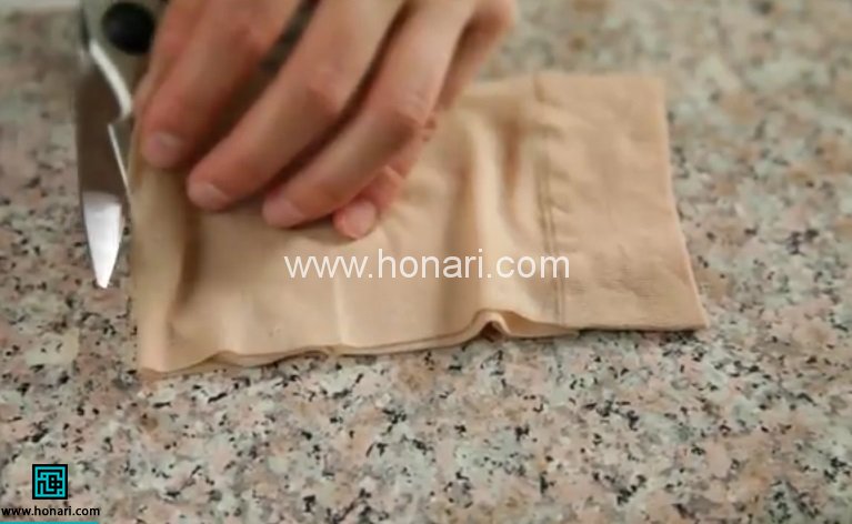برویم سراغ کار: در قدم اول باید گفت جوراب های پارازین برای اینکار بسیار مناسب هستند. جوراب مچی را از وسط تا زده و برش میدهیم… رنگ جوراب اهمیتی ندارد.