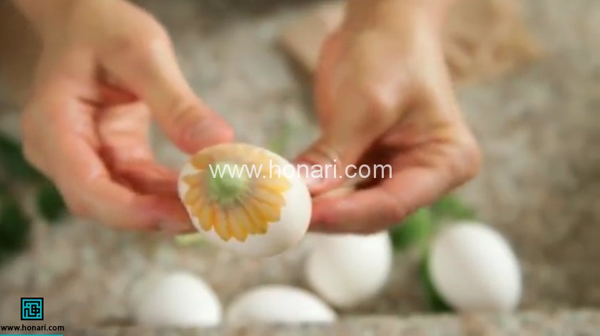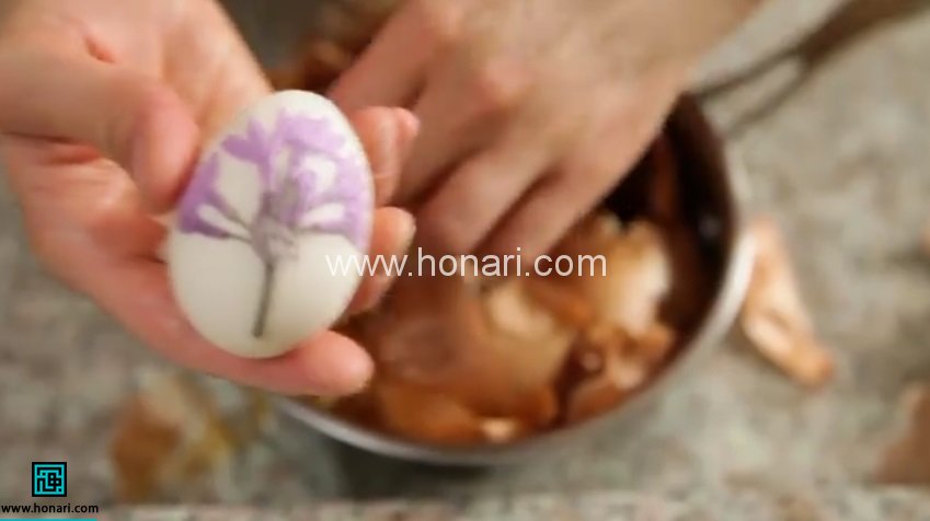 تخم مرغ ها را درون پوست ها پنهان کرده و روی آن ها آب میریزیم.