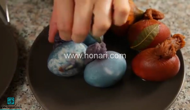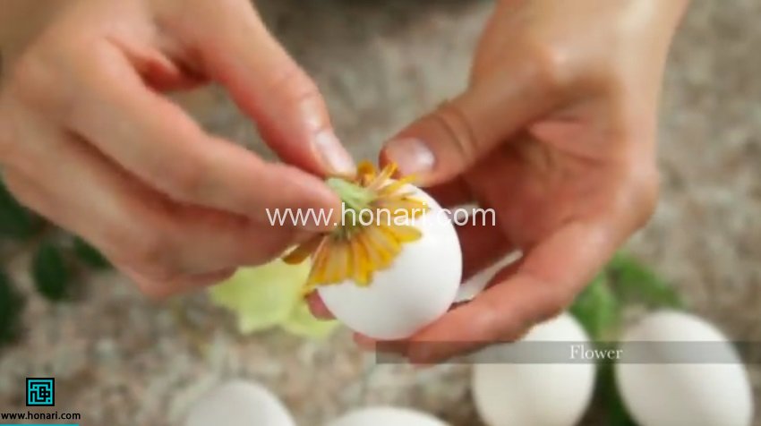 گل های ریز طبیعی و برگ های درختان را جدا می کنیم. گل ها را به صورتی که تصمیم داریم روی تخم مرغ قرار می دهیم در صورت نیاز از شاخه جدا کرده و قسمت های اضافی را قطع می کنیم. گل را درست روی تخم مرغ می خوابانیم و محکم با انگشتانمان نگه می داریم. جوراب را ما بین انگشتانمان گرفته و روی تخم مرغ به حالتی می کشیم که هیچ حرکتی روی گل نباشد و گل زیر جوراب و روی تخم مرغ ثابت بماند. جوراب را مثل کش کشیده و محکم گره می زنیم و تخم مرغ درونش محبوس می شود. گل های بعدی را هم به همین نحو مطابق با سلیقه روی تخم مرغ قرار داده و درون جوراب می اندازیم و گره میزنیم. برگ های آماده شده را هم به صورت کاملا چسبیده به تخم مرغ درون جوراب ها می اندازیم…