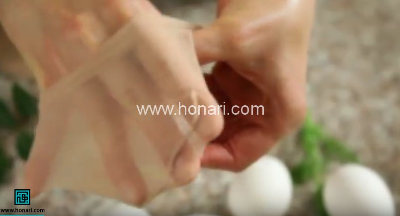 سپس جوراب را بریده و تخم مرغ ها را بیرون می آوریم.