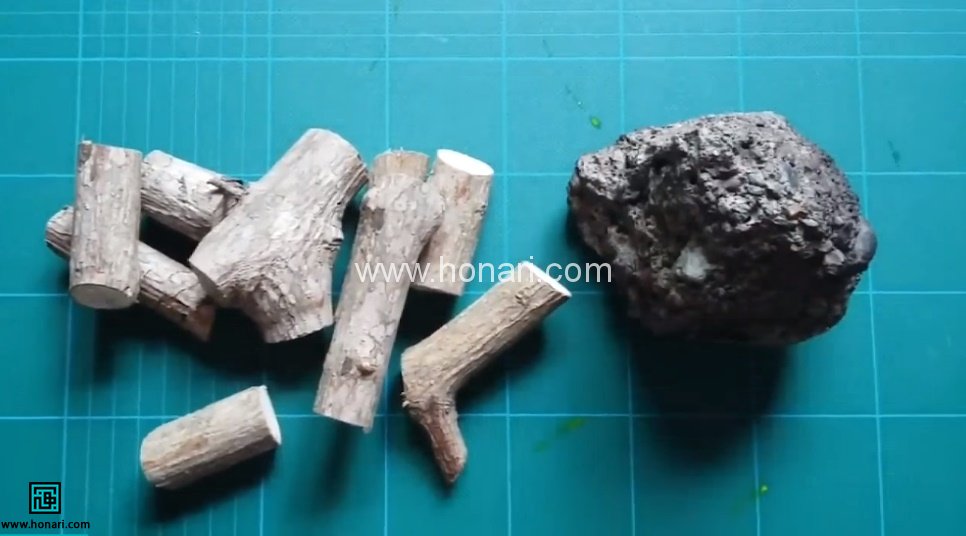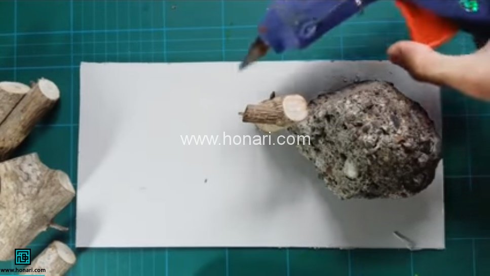 تکه ای از مقوا را به اندازه ی دلخواه می بریم. با کمک چسب حرارتی، تکه سنگ را در سمت چپ یا راست مقوا می چسبانیم. سپس طرف دیگر مقوا را هم چسب زده و تکه های چوب را به فرم دلخواه روی مقوا می چسبانیم.