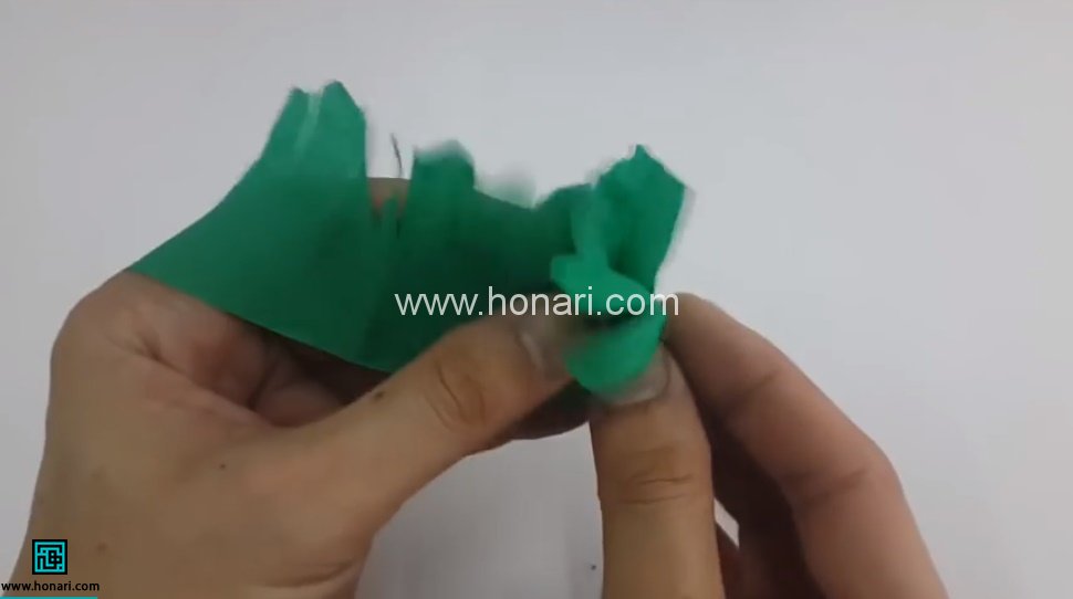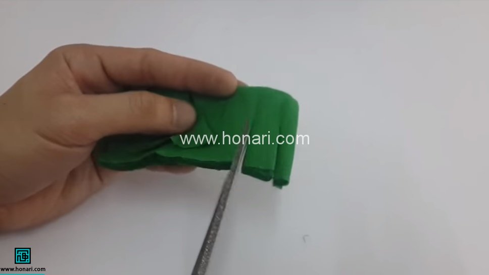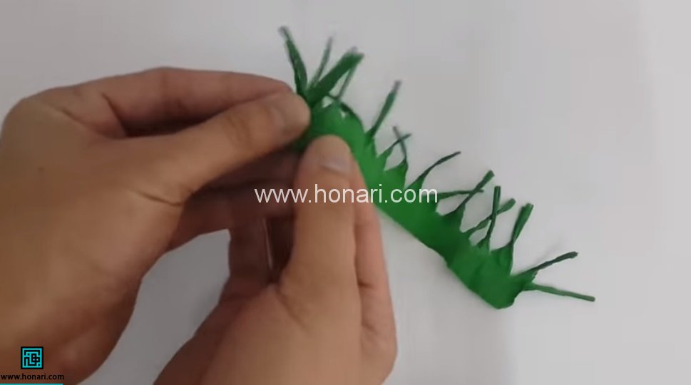 کاغذ کشی که به رنگ سبز انتخاب کرده ایم قرار است سبزه ی مصنوعی ما باشد. کاغذ را چند بار تا زده و می بریم تا نواری بلند به ضخامت 6-7 سانتی متر به دست آید. در طول این نوار چند برش عرضی در طول نوار ایجاد می کنیم. حالا تای نوار را باز می کنیم. نوار به حالت ریش ریش درمی آید. تک تک این برش ها را گرفته و پیچ می دهیم تا شکل زیر به دست آید. نوار را به طول هاب 20-30 سانتی متر می بریم.