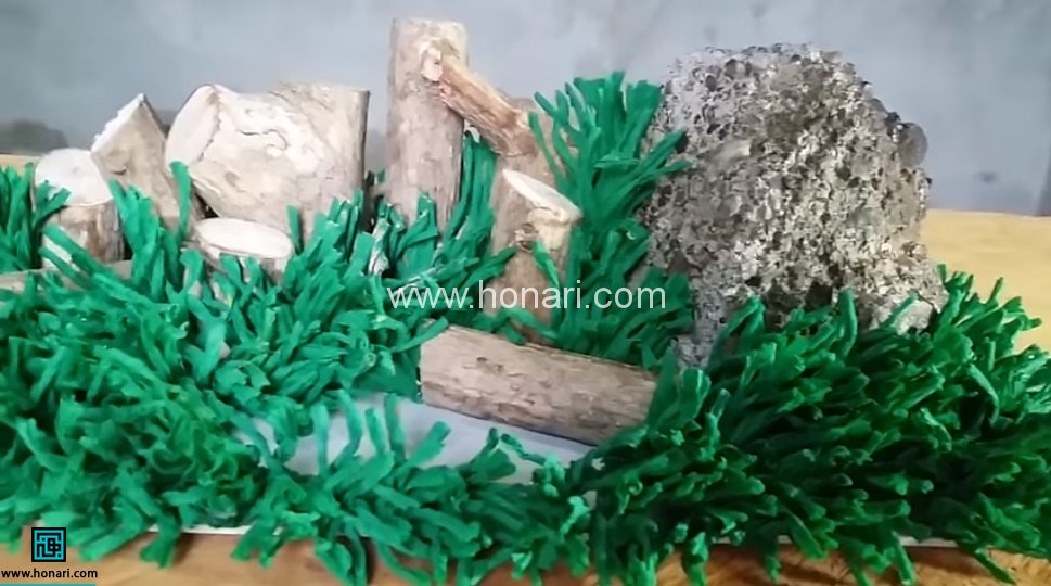 روزنامه را مچاله کرده و به شکل گلوله درمی آوریم. با چسب کلفت شیشه ای، دورش را می پوشانیم تا باز نشود. با چسب حرارتی آن را روی مقوا می چسبانیم. سبزه هایی که ساخته ایم را رویش می چسبانیم تا کاملا پوشانده شود.