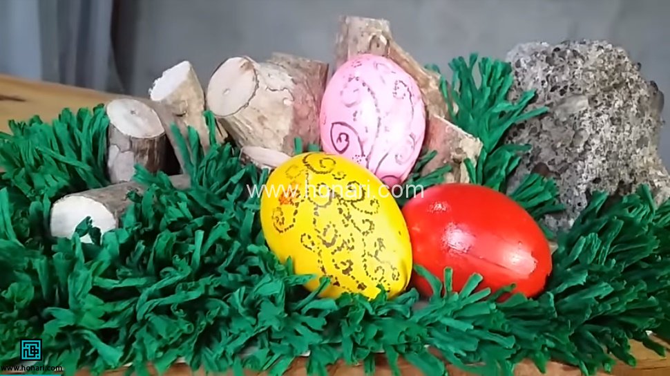 تخم مرغ ها را برداشته و با گواش رنگ کرده و طرح های دلخواه را بر رویش نقاشی می کنیم. آنها را در جای مناسب بین چمن ها قرار می دهیم و با چشم حرارتی می چسبانیم.