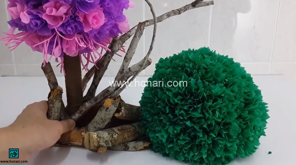 شاخه را با کمک چسب حرارتی میان بریده های چوب، می چسبانیم. می توانید مانند بخش قبل با روزنامه، توپ کاغذی ساخته و گل ها را بدون شاخه پیچانده و روی توپ بچسبانید. سپس توپ را به شاخه چسبانده و شاخه را میان بریده های چوب قرار دهید.