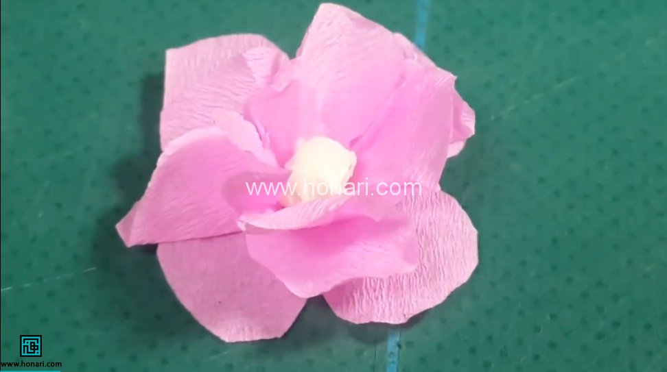 کاغذ کشی صورتی رنگ را به شکل مستطیل تا زده و به شکل شکوفه های بهاری می بریم. سپس با سر خودکار شکل می دهیم. چند بریده ی شکوفه را داخل هم قرار داده و می چسبانیم تا شکوفه های پرپشت تری داشته باشیم. می توانید با رنگ گواش قرمز، برای شکوفه پرچم بکشید یا تکه ای چسب کاغذی را گلوله کرده و وسط شکوفه بچسبانید.