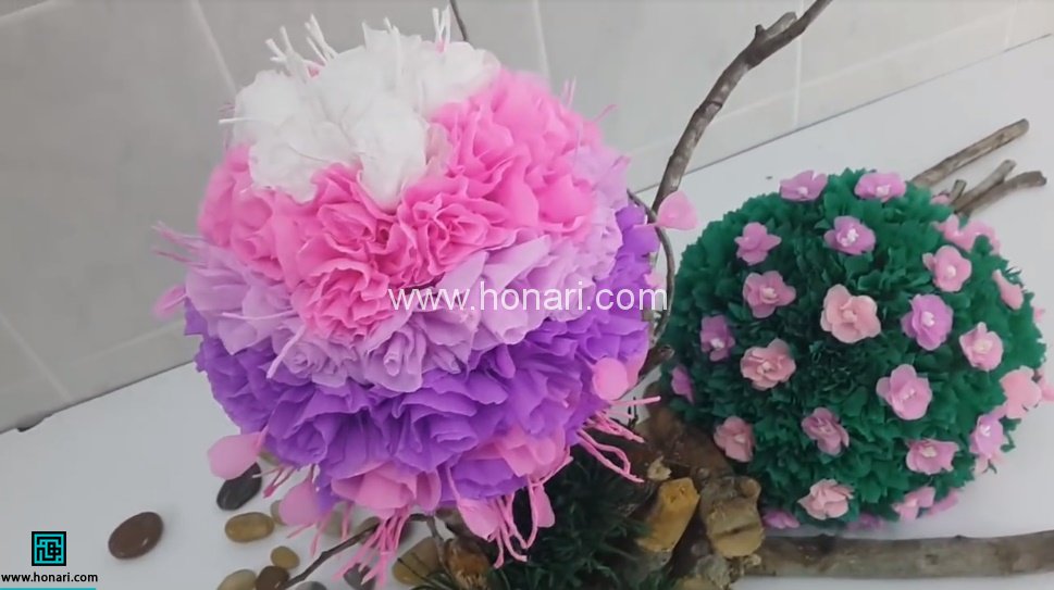 شکوفه را با چسب حرارتی بر روی چوب ها یا توپ سبز می چسبانیم.