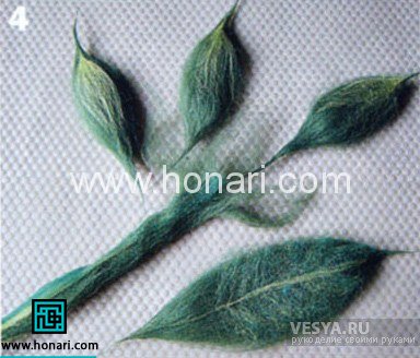 با استفاده از الیاف سبز رنگ،برگ ها رو مثل شكل زیر درست كنید(با باریك كردن ابتدا و انتهای قطعه ی الیاف)