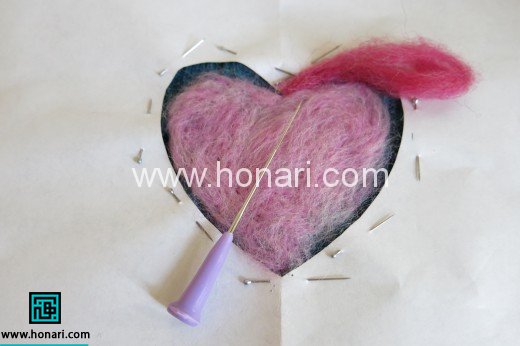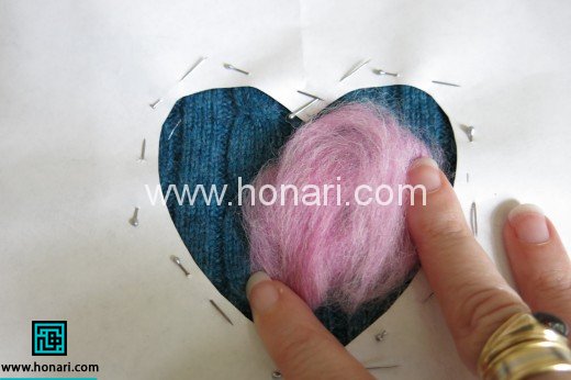 من دوست داشتم قلبم از دو رنگ تشکیل شده باشد. بنابراین فقط لبه کار را با الیاف قرمز کار کردم. باز هم به روش بالا مقداری از الیاف را در جایی خالی قرار داده، اسپری آب و صابون زدم و توسط سوزن الیاف را درون لباس کردم.