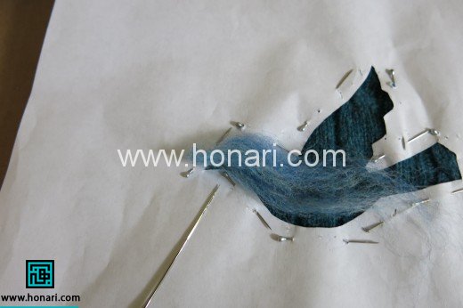الیاف پشمی را درون کار قرار داده و با استفاده از سوزن و اسپری آب و صابون الیاف را به لباش متصل کنید.