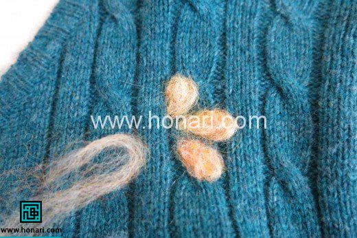 همین طور که می بینید، من گل های کوچک را نیز به طرح لباس خود اضافه کردم. برای این کار مقداری از الیاف را به صورت اشک درآورده و بر روی لباس قرار دادم. سپس با استفاده از سوزن الیاف را به خورد لباس دادم.