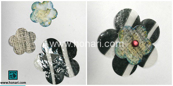 حالا می توانید گل های خود را آن گونه که دوست داشتید قرار دهید و از ابزار سوراخ کن برای ایجاد سوراخی در مرکز هر گل استفاده نمایید. از میخ برای نگه داشتن لایه ها در کنار هم استفاده کنید. شما می توانید مهره هایی را در مرکز کار بچسبانید و آن را با گل تزیین کنید. حالا گل و پروانه شما آماده است. امیدوارم از این آموزش لذت برده باشید.