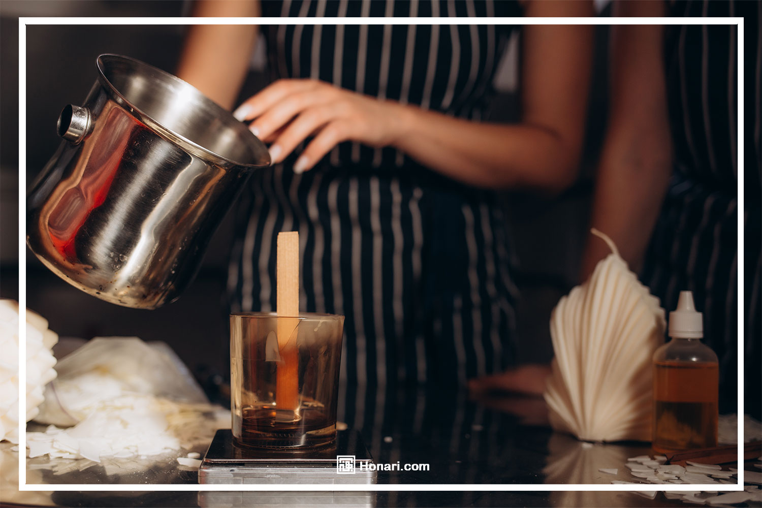 رایحهدار کردن شمع: افزودن اسانسهای روغنی مخصوص شمع (نه هر اسانس عطری) باعث میشود بوی شمع طبیعیتر و ماندگارتر باشد.