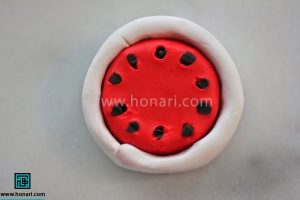3. حالا باید با خمیر مشکی یک نوار باریکی درست کنیم تا بتونیم ازش برای تخم هندونه استفاده کنیم.