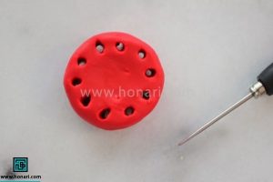 2. بعد با استفاده از درفش و یا هر جسم نوک تیز دیگه مانند خلال دندان ، دور تا دور دایرمون رو سوراخ میکنیم.