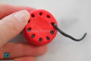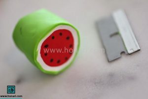 9. در مرحله آخر دو تا سوراخ برای دکمه، روی برش هندونه ایجاد میکنیم .