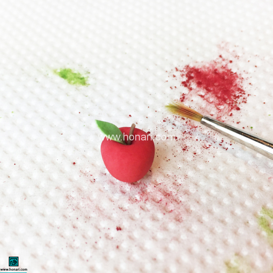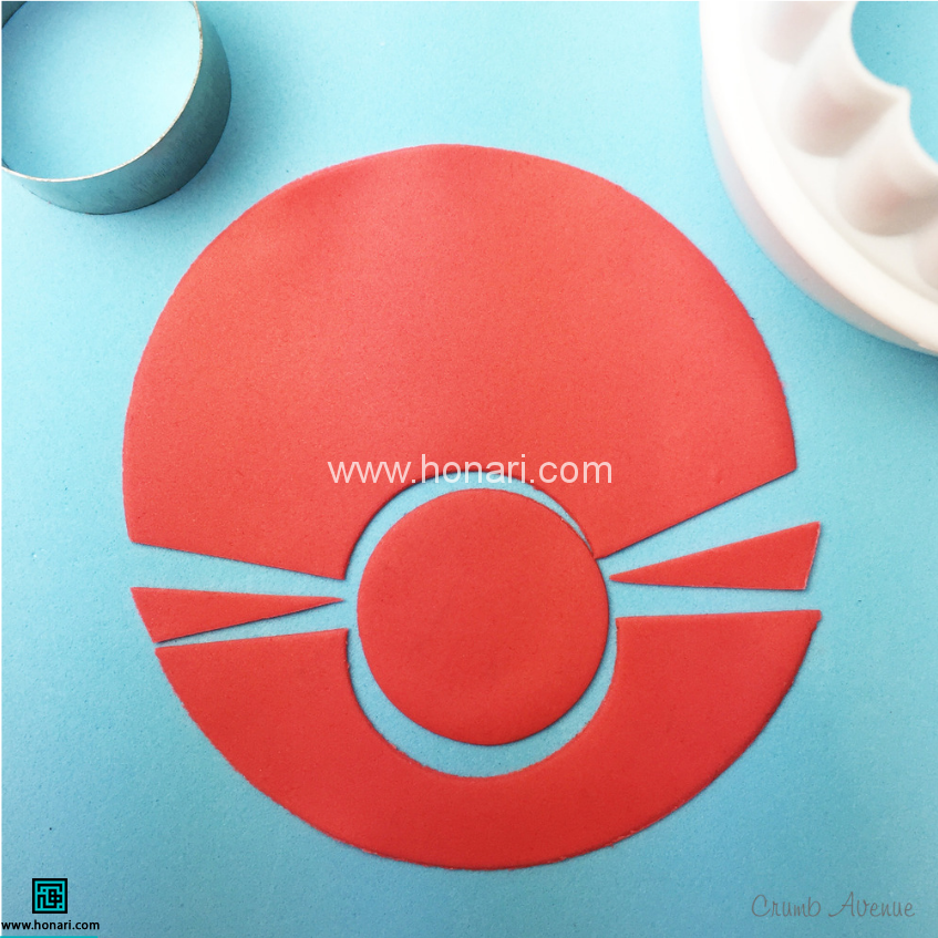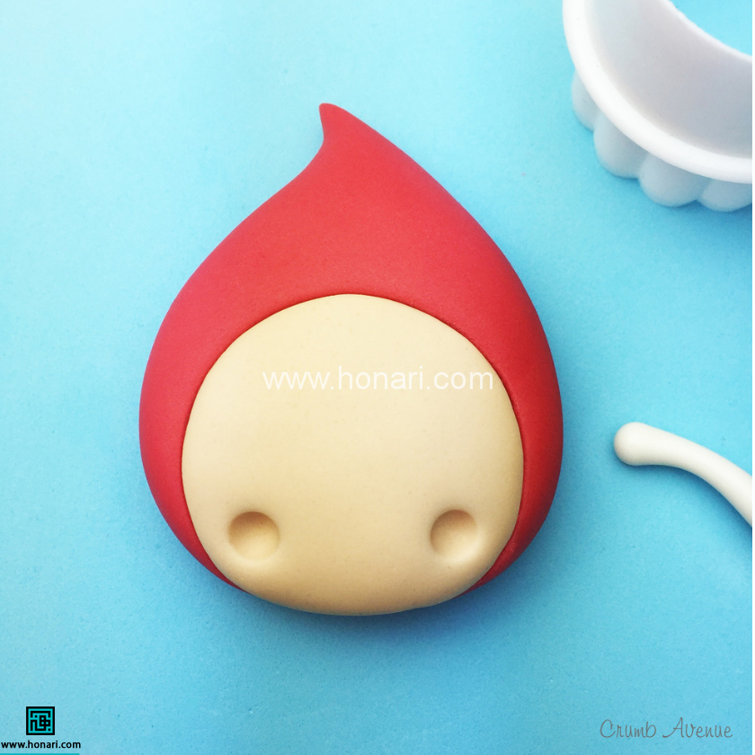 خمیر رنگ بدن رو به شكل دایره مانند در بیارید داخل خمیر قرمز بگذارید.سپس با ابزار روی اون دو تا فرو رفتگی برای چشم ایجاد كنید