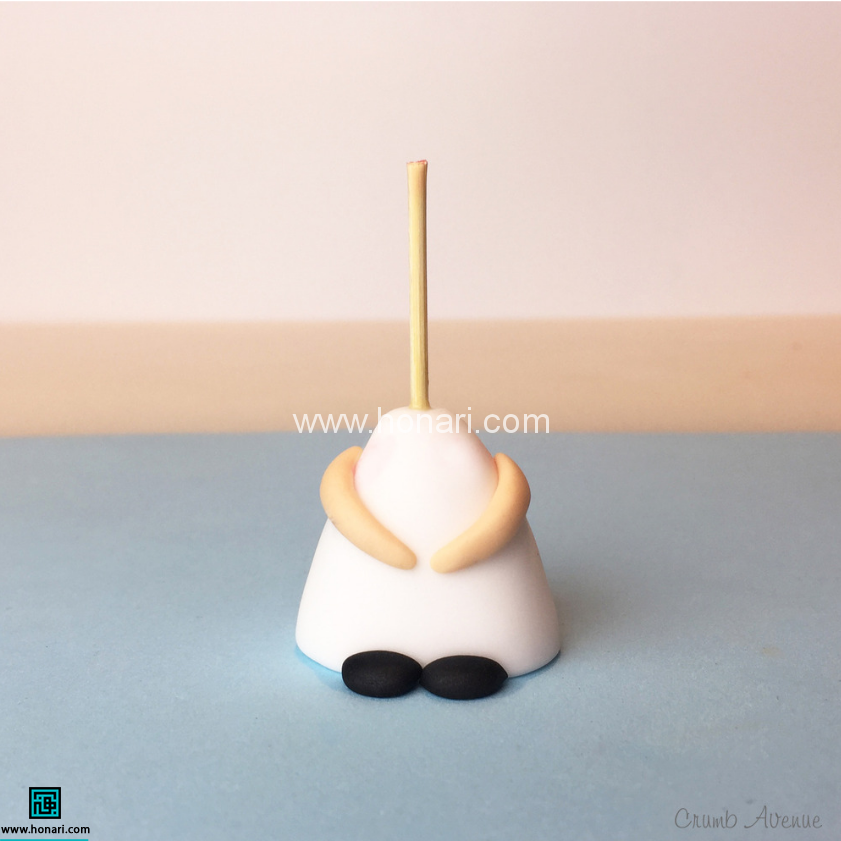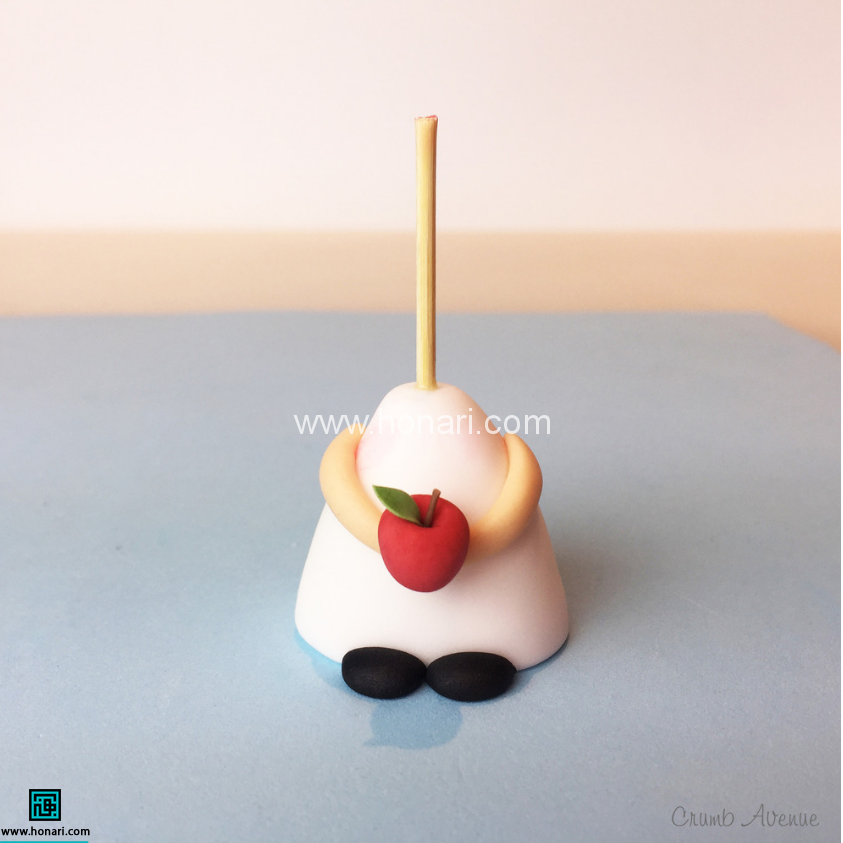 حالا نوبت بدن عروسك هست.با خمیر رنگ بدن دو قطعه ی استوانه ای شكل هم اندازه برای دست عروسك بسازید.سپس دو قطعه ی بیضی از خمیر مشكی برای كفش های عروسك بسازید و رو بدنش كه همو مخروط سفید رنگ هست بچسبونید یك تكه خلال دندان در اون فرو كنید