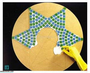 سطح را چسب چوب زده و کاشی های خورد شده را در جای خود میچسبانیم