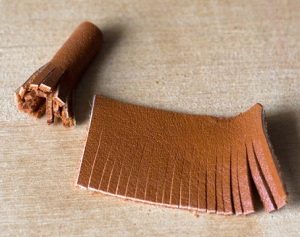 به تصویر بالا نگاه کنید. در این مرحله باید از یک چرم با رنگ روشن استفاده کنید. بر روی چرم روشن مستطیلی که دارای طول هشت سانت و عرض چهار سانت باشد جدا کنید. حالا با استفاده از خط کش و قیچی برش هایی که دارای طول سه سانت می باشند را ایجاد کنید. این چرم را لوله کرده و به منظور جلوگیری از باز شدن، آن را بچسبانید.
