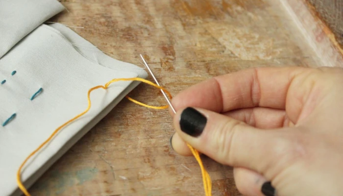 در این مرحله نخ تا جایی بکشید که گره ی انتهای نخ به پارچه برسد